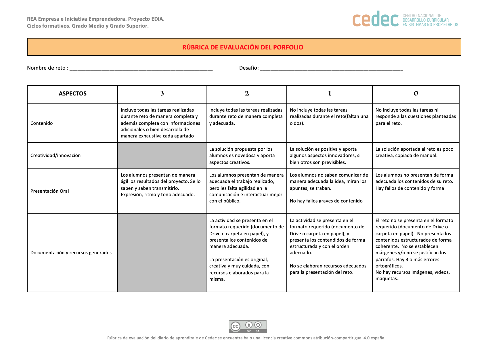 Utilizaremos la rúbrica de evaluación del porfolio para valorar la calidad del mismo (descargar en formato editable odt y en pdf).