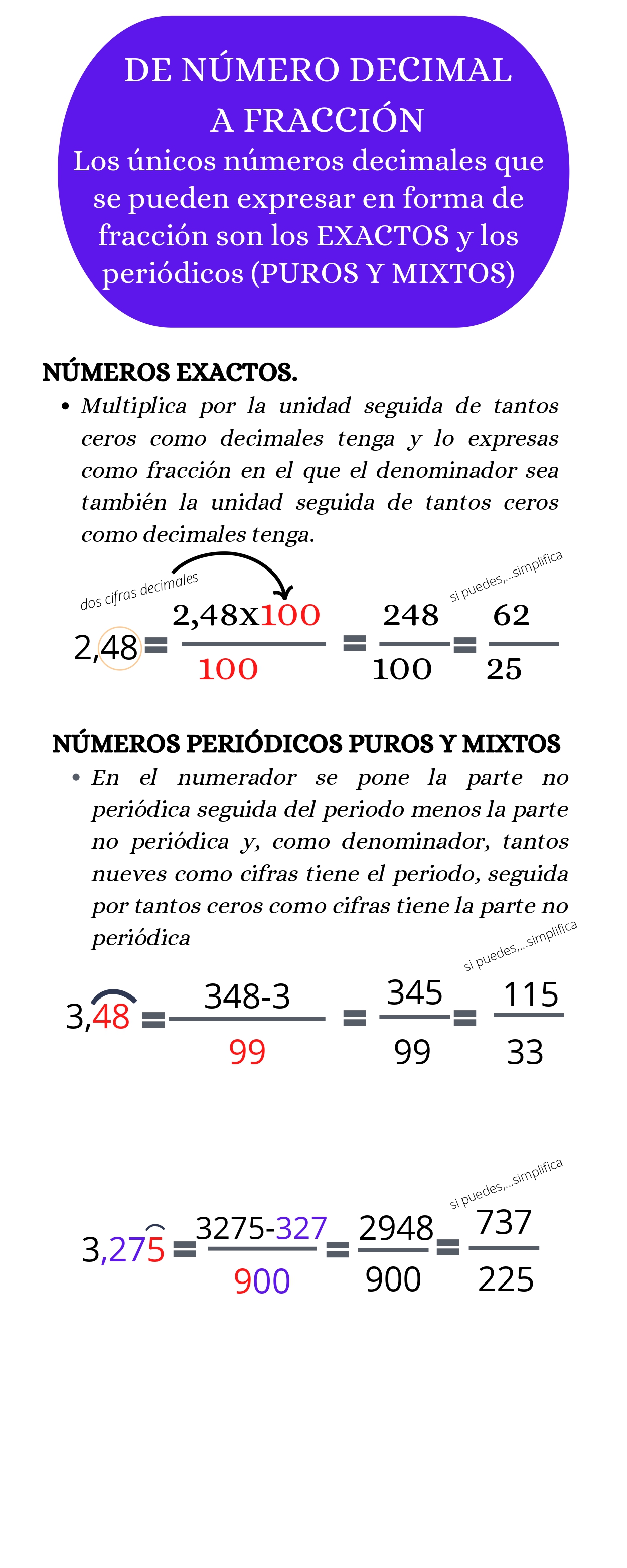 Los únicos números decimales que se pueden expresar en forma de fracciónfracciones son los exactos y los periódicos.