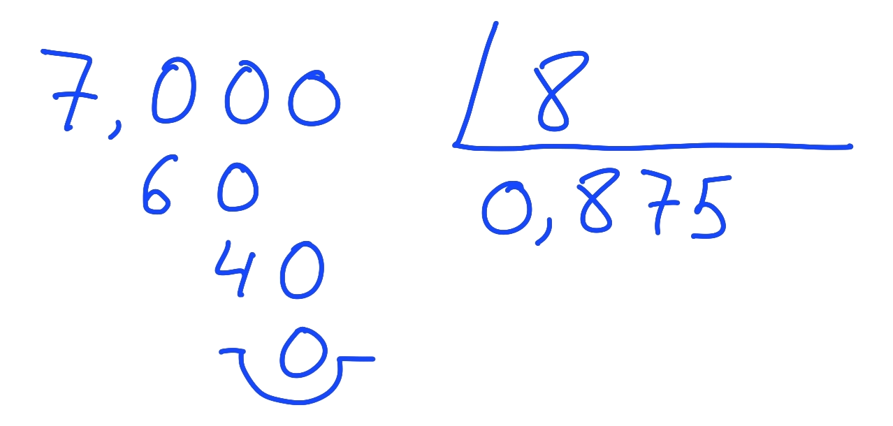 Como sale resto cero se acaba la división y el número decimal es el cociente: $\dfrac{7}{8}=0.875$