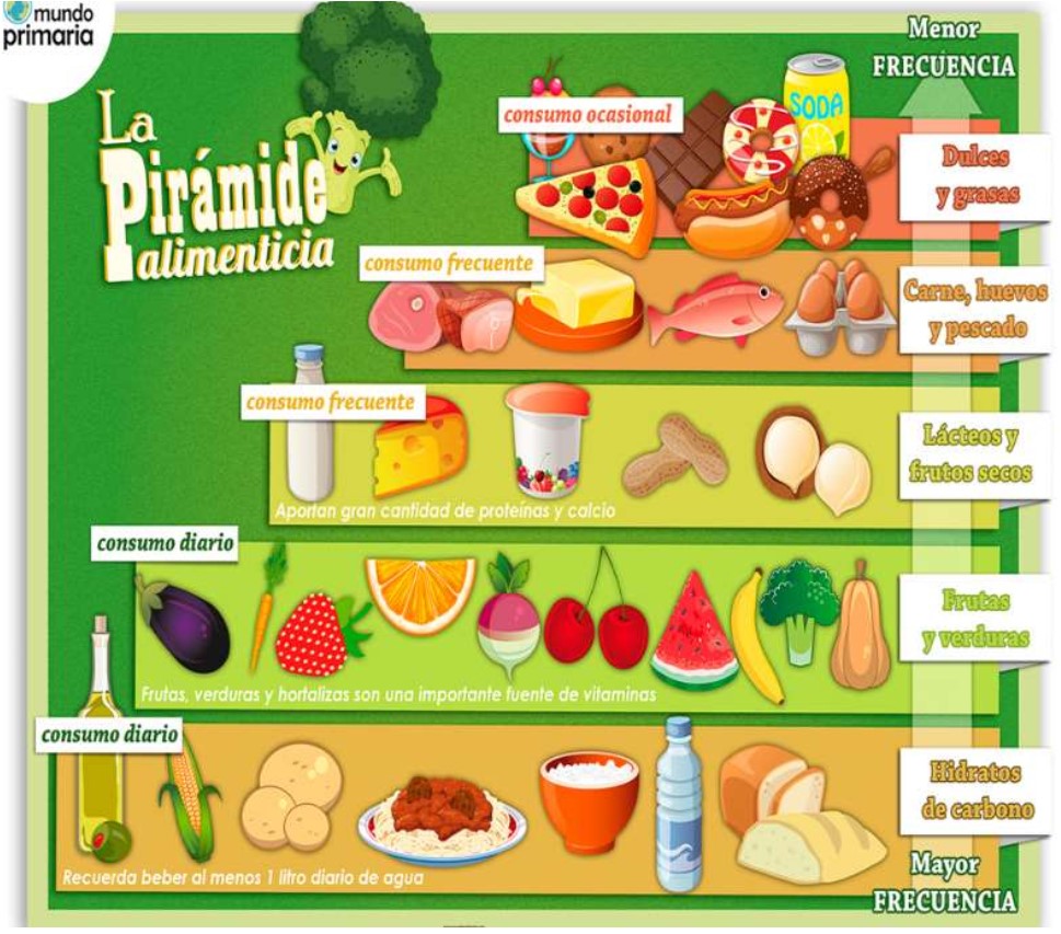 Estudiamos en clase la pirámide de los alimentos y aquellos que son recomendables consumir con mayor o menor frecuencia, según sean más o menos saludables.
