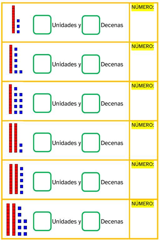 Coge las regletas azules y rojas, fíjate bien en sus colores y tamaños. Escribe cuántas decenas y cuántas unidades hay representadas en cada número.