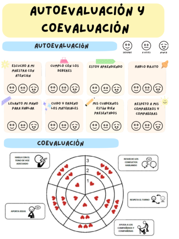 A través de esta herramienta, los niños podrán evaluar aspectos como el trabajo en equipo, el cumplimiento de la tarea y el esfuerzo realizado, utilizando pictogramas que representan diferentes niveles de logro (por ejemplo, caritas sonrientes, neutrales o tristes). Esto no solo les ayudará a identificar sus fortalezas y áreas de mejora, sino que también les permitirá dar retroalimentación constructiva a sus compañeros de forma accesible y comprensible.