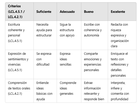 Acción y expresión: escritura libre, lectura compartida, dibujos opcionales.