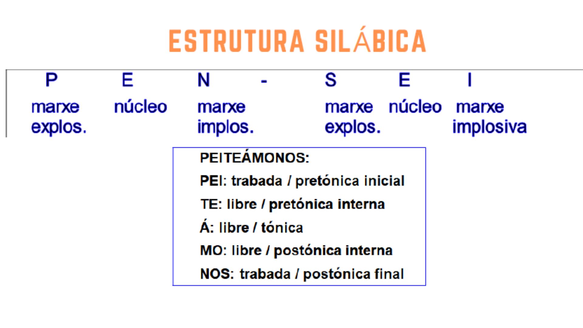 A sílaba é o fonema ou conxunto de fonemas que se pronuncian nun único impulso expiratorio. Constitúese dun núcleo e dunha ou varias marxes silábicas. Denomínase marxe silábica explosiva (ou inicio) á parte da sílaba que precede o núcleo e implosiva (ou coda) aquela que se pronuncia despois do núcleo. O núcleo silábico é necesariamente unha vogal; as marxes silábicas son consoantes ou as vogais i e u no caso dos ditongos.