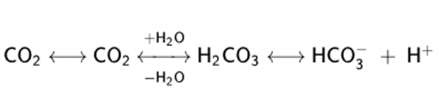 Reacció que mostra com el diòxid de carboni, en presència d'aigua (en sang) passa a formar àcid carbònic (H2CO3) i aquest  es dissocia en protons (H+) i ió bicarbonat (HCO3-).