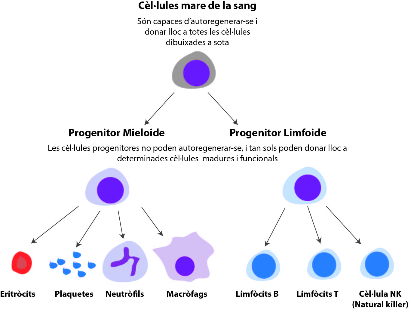 Les cèl·lules mare pluripotencials originen altres dos tipus de cèl·lules mare, les mieloides i les limfoides. Les cèl·lules mieloides comencen a desenvolupar-se a la medula òssia vermella i donaran lloc als eritròcits, plaquetes, monòcits, neutròfils, eosinòfils i basòfils. Les cèl·lules limfoides completen el seu desenvolupament als teixits limfàtics i són l'origen dels limfòcits.