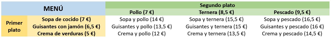 Sol. A partir de los resultados de la tabla, Ramón, con sus 14 €, podría elegir 4 combinaciones de primer y segundo plato sobre las 9 combinaciones obtenidas en la tabla.